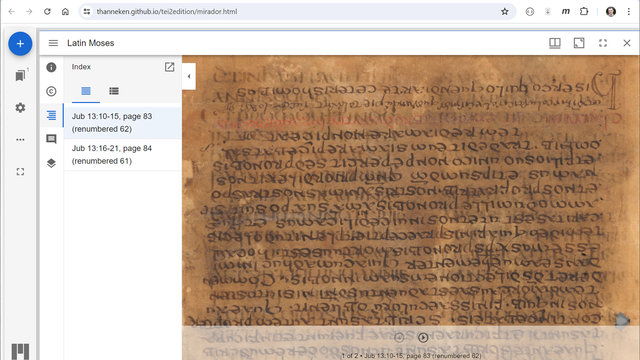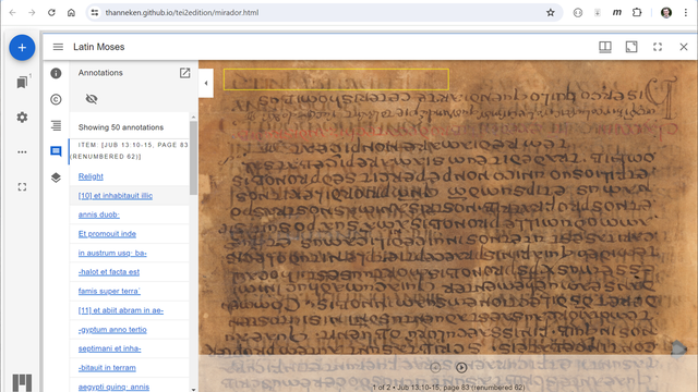 Similarly, my goals for viewing facsimile images and annotations led me to Mirador and the IIIF Presentation API. At this point I could have moved forward with two technologies for different goals of the project. Today I would like to say more about why I integrated TEI and IIIF, how I did it (facing what challenges), and why I favored a streamlined approach.