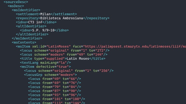 The utility of the Text Encoding Initiative Guidelines for encoding texts suitable for production of critical editions is well established (Burghart 2017). In the past, those have been substantially static editions in print or online (Driscoll and Pierazzo 2016). Meanwhile, the dominant set of standards for presenting images of manuscripts is the International Image Interoperability Framework (IIIF). The most popular viewer based on IIIF is Mirador. With the essential information encoded according to IIIF standards, Mirador can display images of manuscripts with multiple image layers per page and annotations of transcriptions and descriptions. There are practical and theoretical challenges in producing an edition with all the advantages of each. For one, they use different languages. TEI uses eXtensible Markup Language (XML), while IIIF uses JavaScript Object Notation (JSON). The deeper difference is in how a text is conceptualized and structured. TEI, properly used, asks us to think of texts as abstractions with divisions, paragraphs, sentences, and words. IIIF asks us to think about a manuscript as a sequence of canvases of pages. Annotations are mapped to x and y coordinates on those pages. These challenges can, however, be surmounted. In fact, TEI can encode all the information that would be necessary to derive a IIIF Presentation manifest and annotations for each line of a manuscript. There are several benefits of centralizing work on a manuscript in TEI and automatically deriving IIIF information. First, a scholar is asked to master only one language and one set of guidelines. TEI is not necessarily easy to master, but the guidelines are consistent and all in one place. Second, there is no duplication of information pertinent both to critical editions and an interactive manuscript viewer. For example, the transcription of the text is only edited once. We avoid conflicts that arise when one file is updated and not another. Third, just as the complexity of human-edited source files is reduced, so too the complexity of project team can be reduced. It is not at all implausible that a single scholar could learn the necessary TEI standards and have little or no need for technical collaborators. Collaboration of large teams certainly has advantages for projects funded by government grants and large institutions. A simpler model, however, is accessible to individual scholars with little or no funding (Pierazzo 2019). In that way, the streamlined minimal computing approach described here addresses the conference theme of “addressing global inequities in access to technology.”