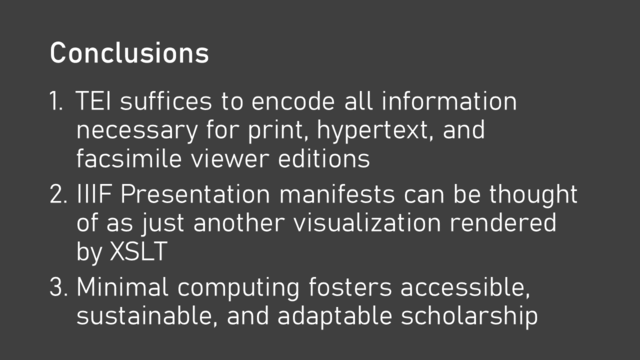 When I say I integrated TEI and IIIF, I mean I created a workflow that puts TEI at the head and derives everything else from that one source. For each visualization there is a different eXtensible Stylesheet Language Transformation (XSLT) that renders the different visualizations (although there are other ways of doing it). One of the main advantages of the single-authority model for us is that we can make changes in one file that will automatically cascade to the print edition, hypertext edition, and IIIF Annotations. Our edition is a work in progress.